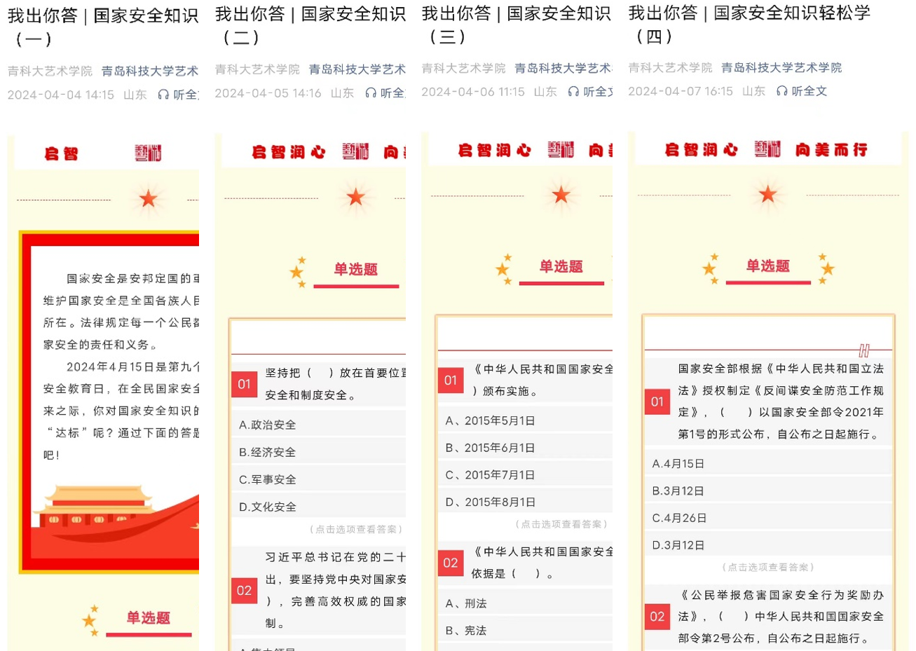 国安标语青年说,知识问答一起学。4月4日-4月7日期间,通过你出我答的形式在微信公众号连续推出四期国家安全知识轻松学。公司将国家安全知识作为进行国家安全教育的重要抓手,通过单选题、多选题、判断题等多种考察模式精心设置每一期的学习内容,确保兼顾学习内容的广度和深度。除此之外,各团支部为进一步加强支部青年员工对于国家安全宣传的认识,发起了“国安标语青年说”特色活动,青年员工在国家安全宣传语思考的过程中,进一步深化自身维护国家安全主人翁角色意识。