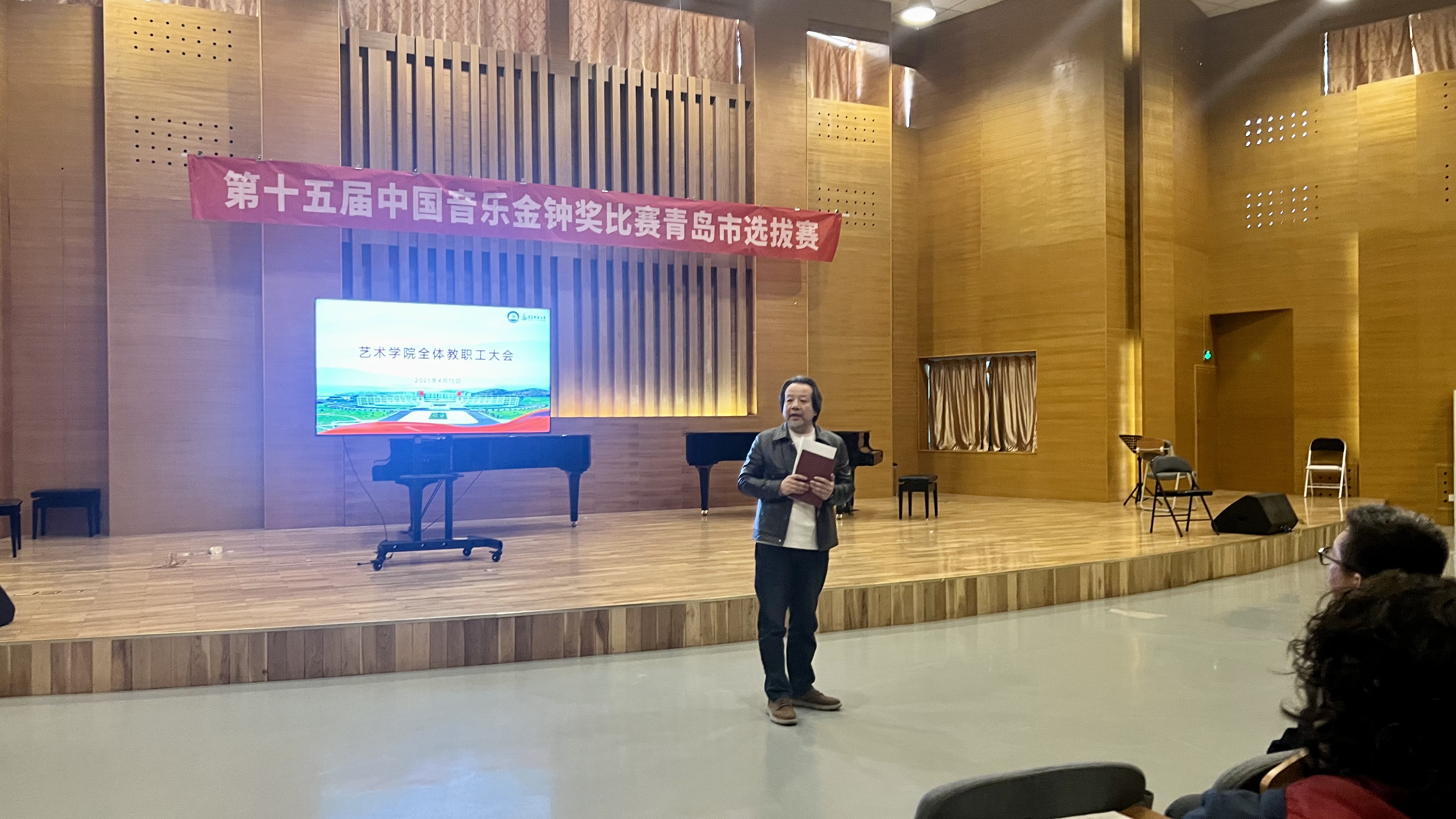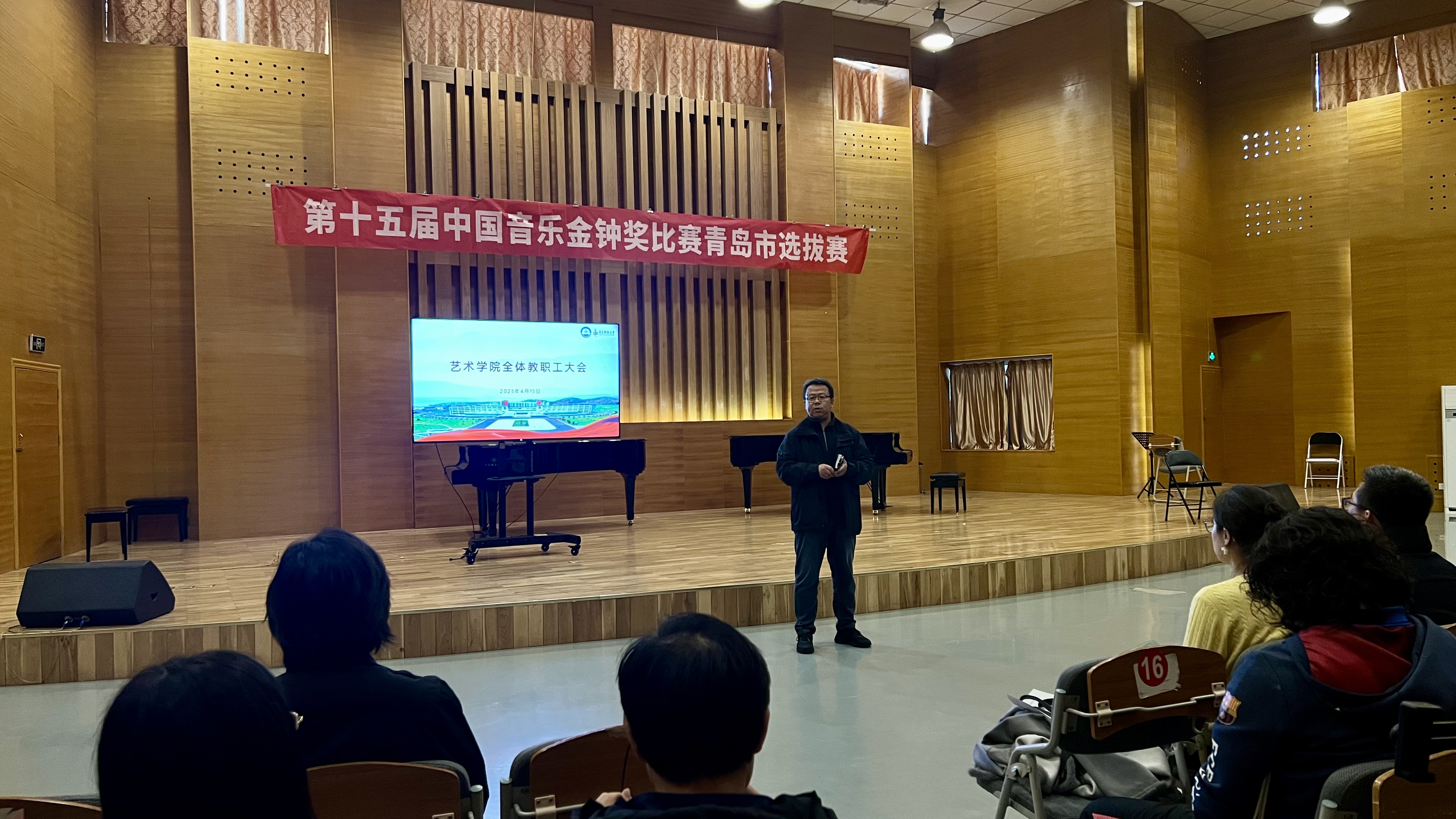 4月15日,十大体育网站于音乐厅召开全院教职工大会,会议由刘庆主持。