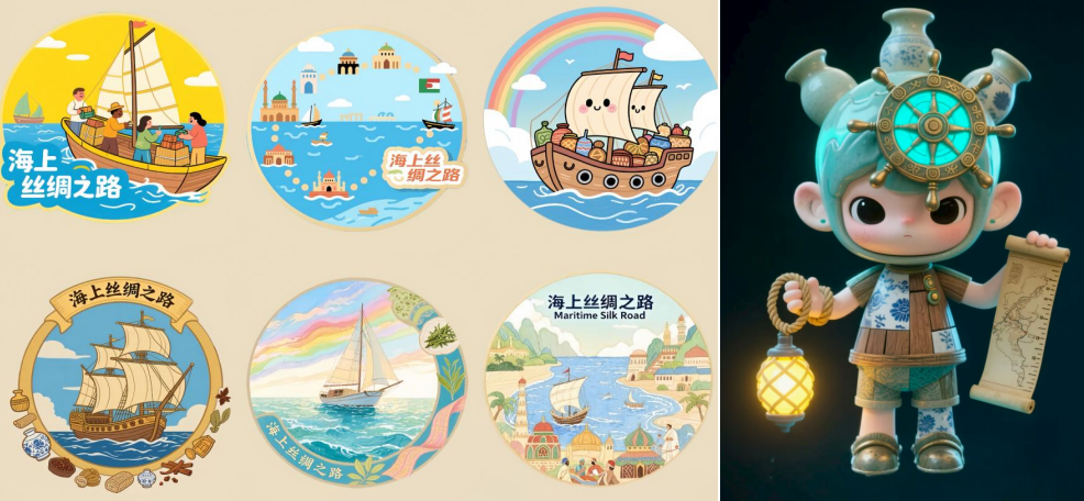 访海上丝绸之路博物馆,千年商路的繁华被一一呈现。青瓷、丝绸、古船模型等展品,承载着海上丝绸之路的悠久历史与文明互鉴的记忆。讲解员从汉代海上陶瓷之路娓娓道来,一直讲到如今的“一带一路”倡议,让队员们明白文化交流对乡村经济的带动作用——古代丝路让瓷器茶叶走出乡村,今天要让红色文化与乡土特产通过现代丝路走向全国。参观时,实践团恰逢当地少先队员,老员工们用通俗易懂的语言为小朋友讲解古代造船技术,小朋友们则声情并茂地描绘自己眼中的海上丝绸之路,不同年龄段的交流碰撞出独特火花。实践团还利用工具设计多款戚继光IP形象及主题系列表情包,巧妙融合英雄精神与丝路文明。