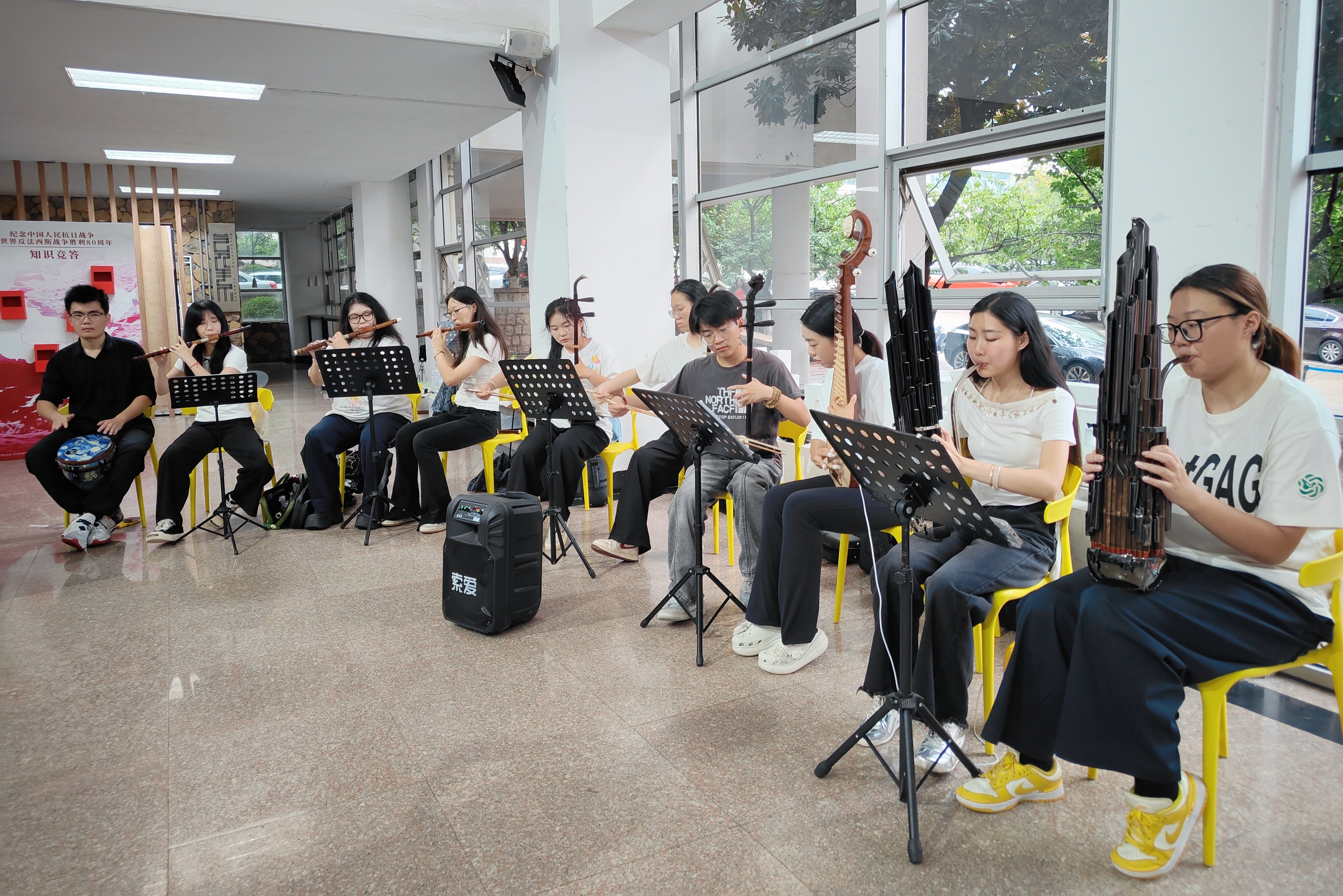 丝竹悠扬,乐动青春。由音乐专业员工组成的“迎新小乐团”现场奏响《青春校园》《兰亭序》等经典曲目,筝笛和鸣,丝竹婉转,成为迎新日中一道靓丽的艺术风景线。