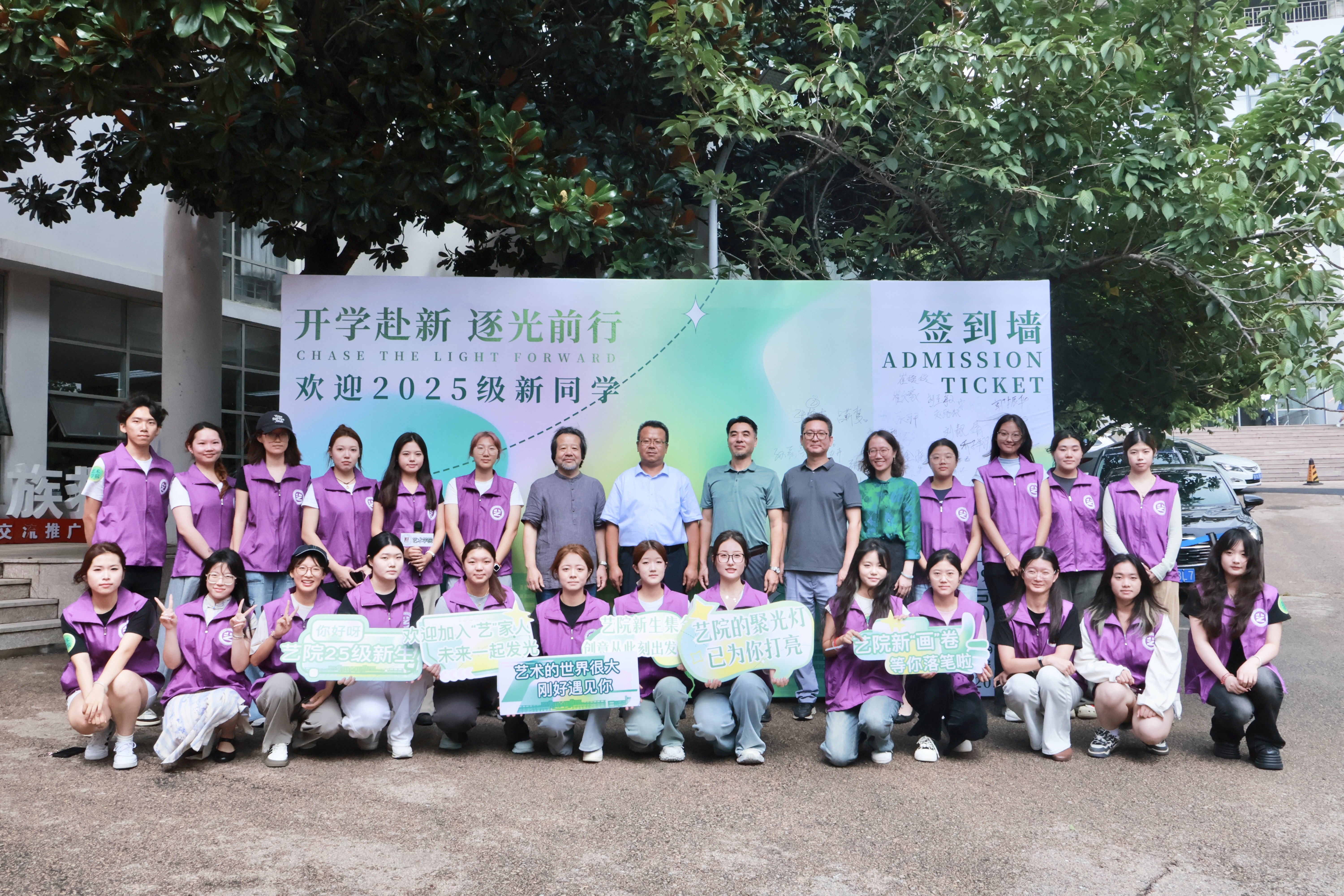 志愿同心,聚力迎新。志愿者们提前精心布置场地、细化分工,迎新当日,他们穿梭在校园各处,为新生提供引导、答疑和行李搬运等贴心服务,用实际行动展现艺院学子的热情与担当。