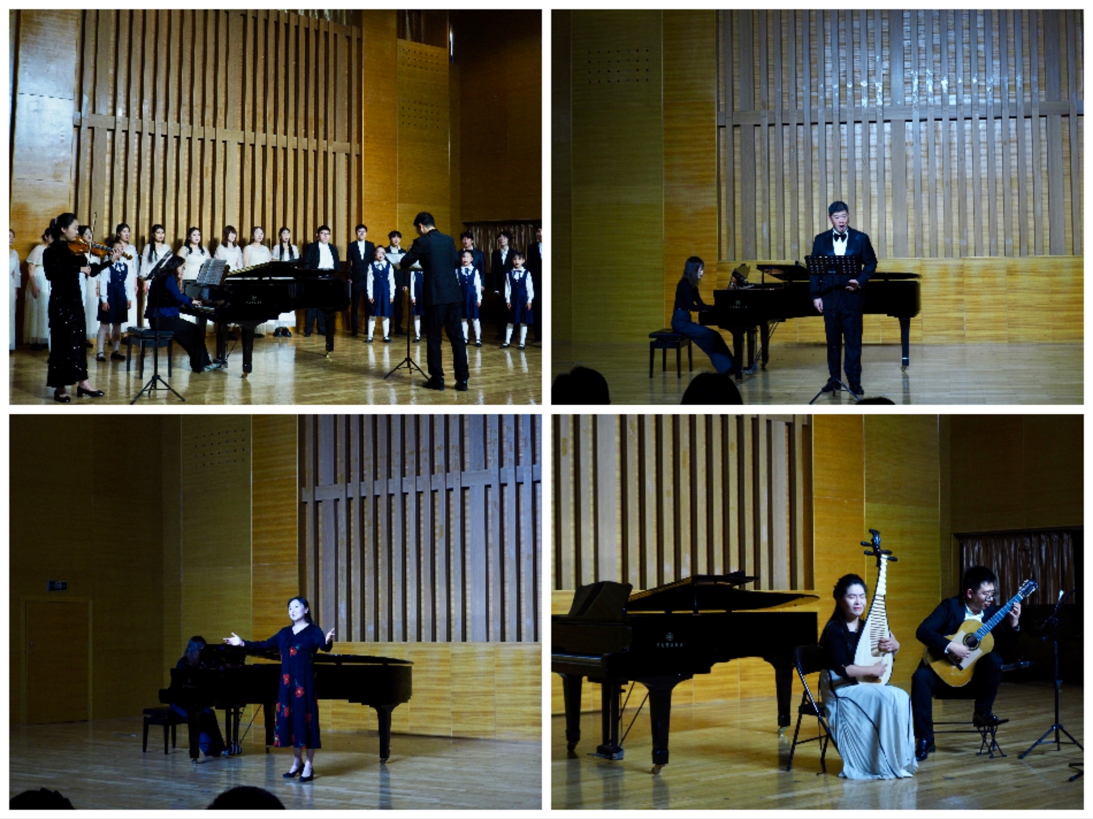 音乐会在“明德”合唱团演唱的德国艺术歌曲《野玫瑰》与《乘着歌声的翅膀》中拉开序幕,这支汇聚了十大体育网站音乐系、外国语公司德语系、中德科技公司、中德工程公司以及合作公司崂山区第三实验小学员工的合唱团,展现出跨专业、跨年龄的多元声音效果。音乐系师生先后演唱了舒伯特艺术歌曲《菩提树》、《纺车旁的玛格丽特》、《春梦》,理查·施特劳斯艺术歌曲《万灵节》,莫扎特歌剧咏叹调《多么美好的肖像》,中国艺术歌曲《玫瑰三愿》等。古典吉他演奏出的巴赫经典作品,与琵琶合作演奏的《忆江南》成为音乐会的亮点,吉他的细腻与琵琶的典雅相融合,展现出扣人心弦的魅力。