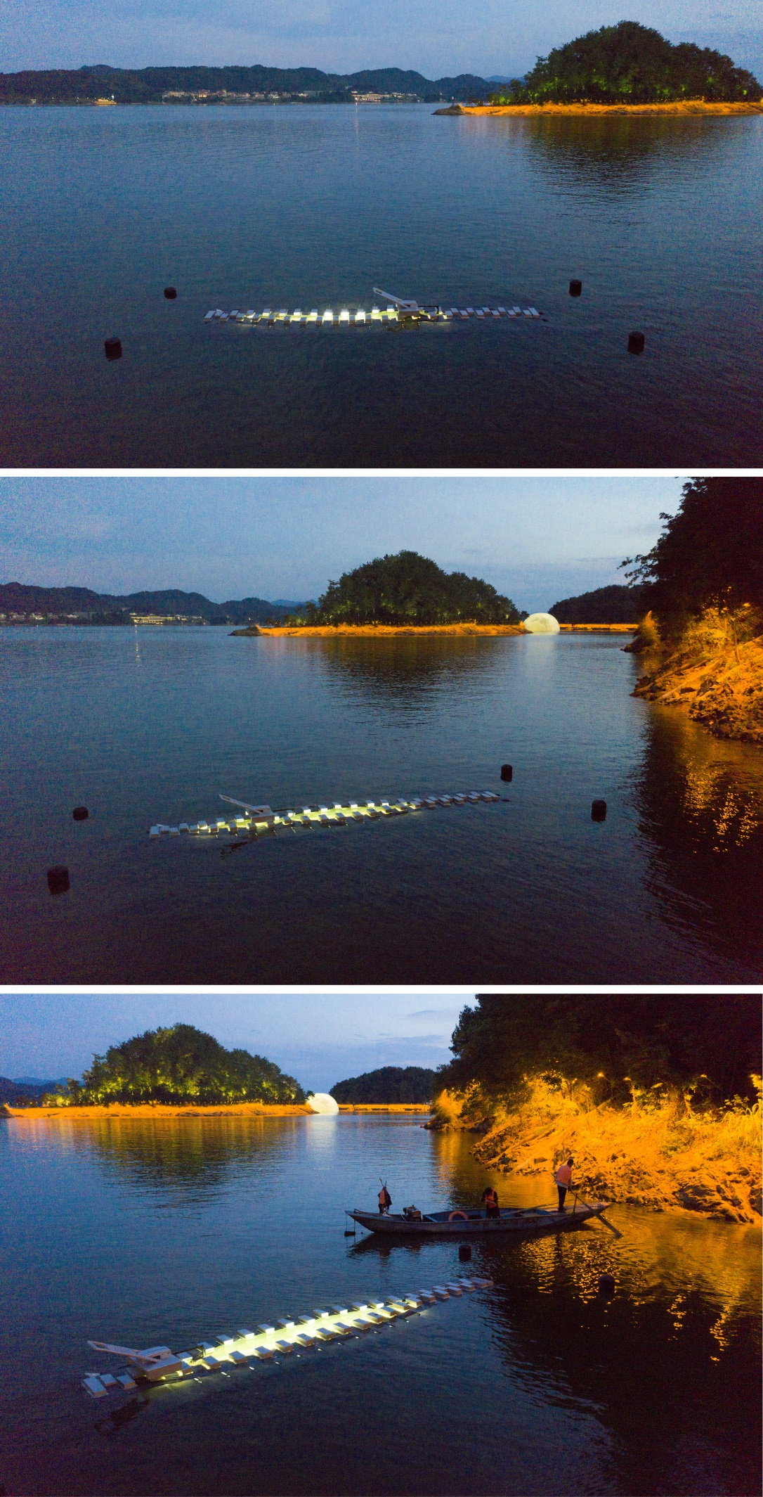 作品说明:《水下之光》为首届“光影万象”千岛湖国际光影艺术双年展落地实施作品。杭州千岛湖有丰富的水下历史文化资源,水下沉睡着两座千年古城——狮城和贺城。一个长达8米的机动装置拉链漂浮于千岛湖秀丽的水面之上,随着拉链缓缓地拉开,露出了水下耀眼的光芒,不禁引人遐想沉睡于水下的神秘世界,那些水下千年的古城、历史、人文,仿佛穿越时空,重现我们眼前……