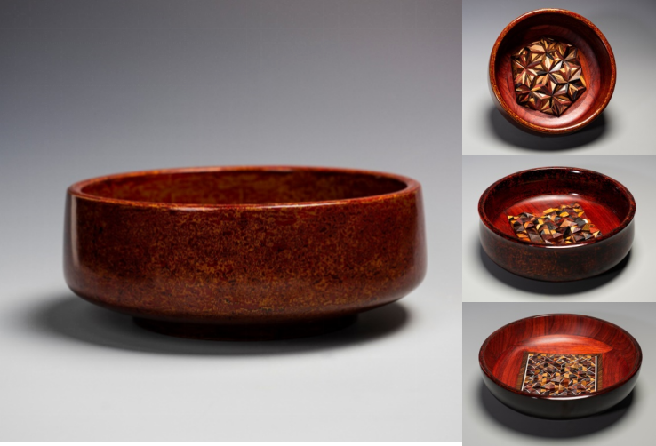 作品说明:等待是时间的艺术,每一件漆器都是时间的艺术品。整个作品用到各种不同颜色的木材料,有黑色的紫光檀,红色的红花梨,紫色的紫芯木,绿色的绿檀,黄色的黄杨木,还有南美酸枝,黄金樟,黑胡桃等。多彩的色泽是最淳朴的美,为了更好展示木的本色,对钵体内部的木材料采用了传统烫蜡工艺,钵体外表面则是大漆工艺。作品从设计,定稿,木胎制作,调漆,批灰,裱布,做肌理,髹色漆,打磨,抛光,历时六个月,胎体上一层又一层的大漆涂层犹如一层层时间的冲刷。等待,才会开出时间的花,结出艺术的果实。