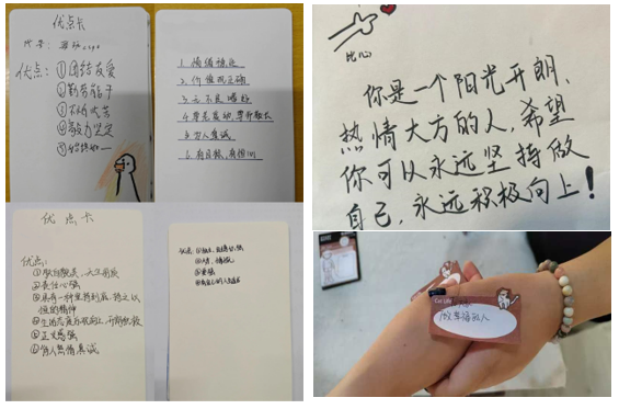 活动由三个环节构成。第一个环节是“优点大轰炸”,参与者在便利贴上写下被赞扬同学的名字及其优点,并将这些便利贴投入收集箱内。随后,主持人逐一宣读这些内容,由现场同学猜出作者。这些便利贴卡片作为礼物赠送给被赞扬的同学,以作纪念。暖心的交流使得平时藏在心底的话语得以被诉说,加强了彼此间的正向互动。